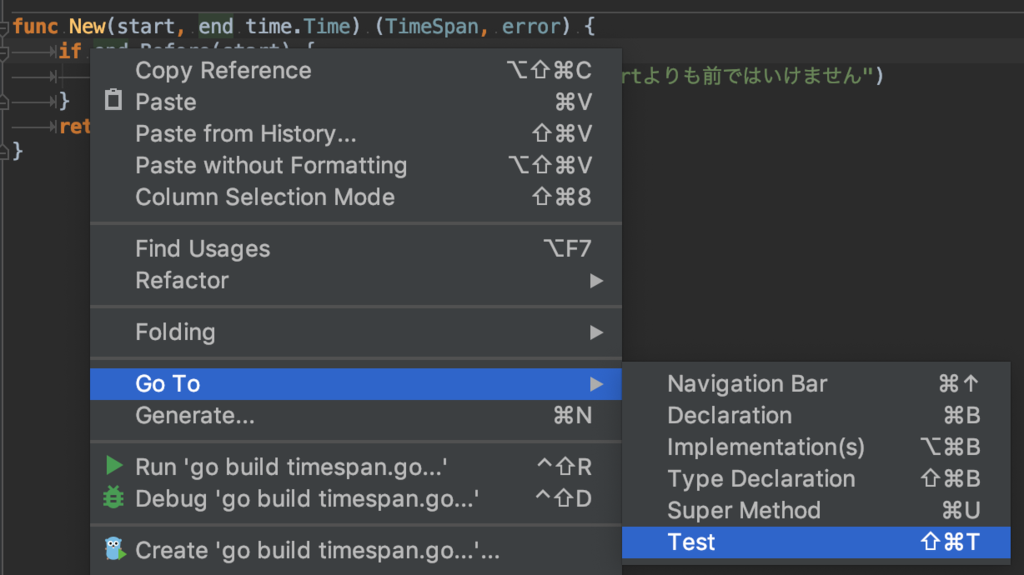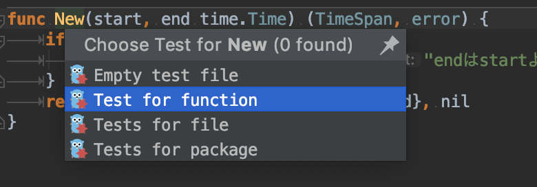 GoLandでは自作の関数やメソッドに対して簡単にTable Driven Testを書く機能がついています。