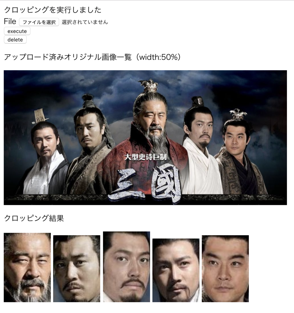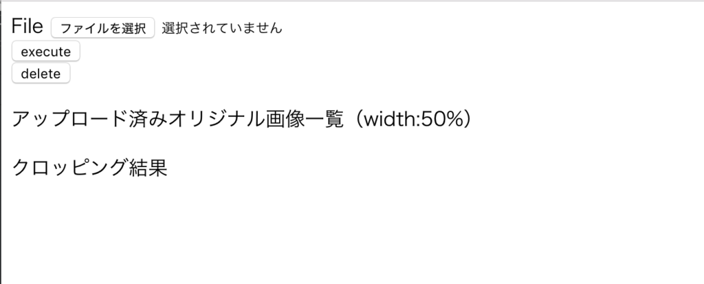 Viewに関してもシンプルです。 executeボタンでクロッピングを実行し、結果を画面下部に表示させるだけのものです。 executeするたび、ローカルstorageにアップロードした画像がどんどん溜まっていくのが嫌なので、一応deleteボタンは用意しています(押すとstorage内の画像が全てお掃除されます)。